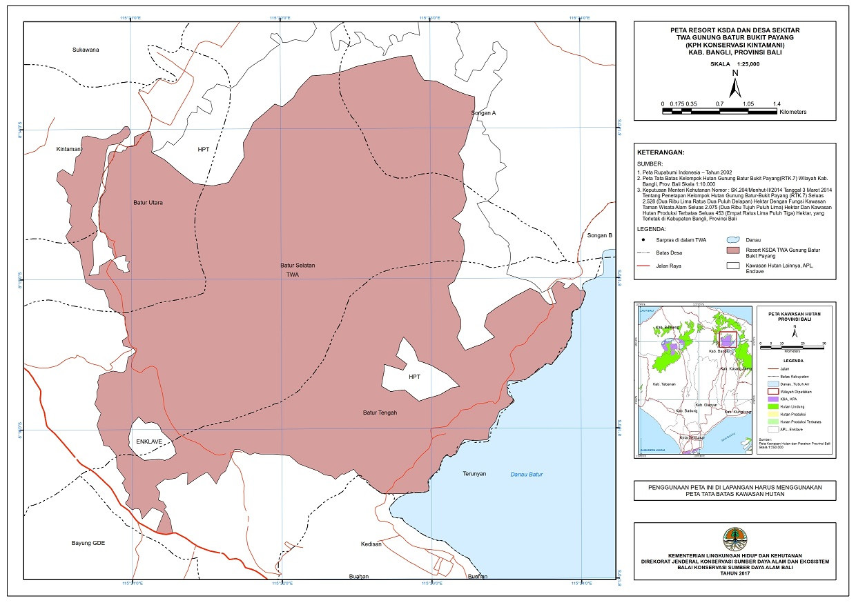 Keputusan Menteri Kehutanan Nomor SK.204/Menhut-II/2014 tanggal 03 Maret 2014 tentang Penetapan Kelompok Hutan Gunung Batur-Bukit Payang (RTK.7) seluas 2.528 Ha dengan Fungsi Kawasan TWA seluas 2.075 Ha dan Kawasan Hutan Produksi Terbatas seluas 453 Ha, yang terletak di Kabupaten Bangli, Provinsi Bali.